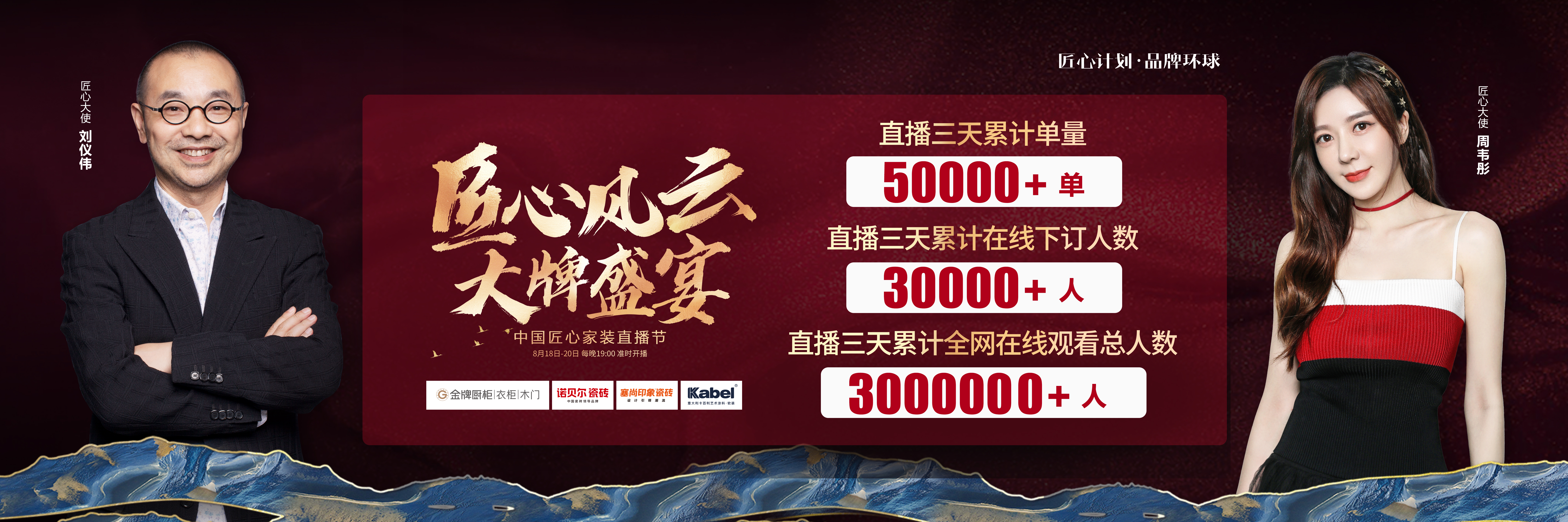 由完美电竞厨柜、诺贝尔瓷砖、塞尚印象瓷砖、卡百利艺术涂料联合缔造,创赢科技系统支持全案营销执行的“匠心风云 大牌盛宴”中国匠心家装直播节于8月20日圆满落...